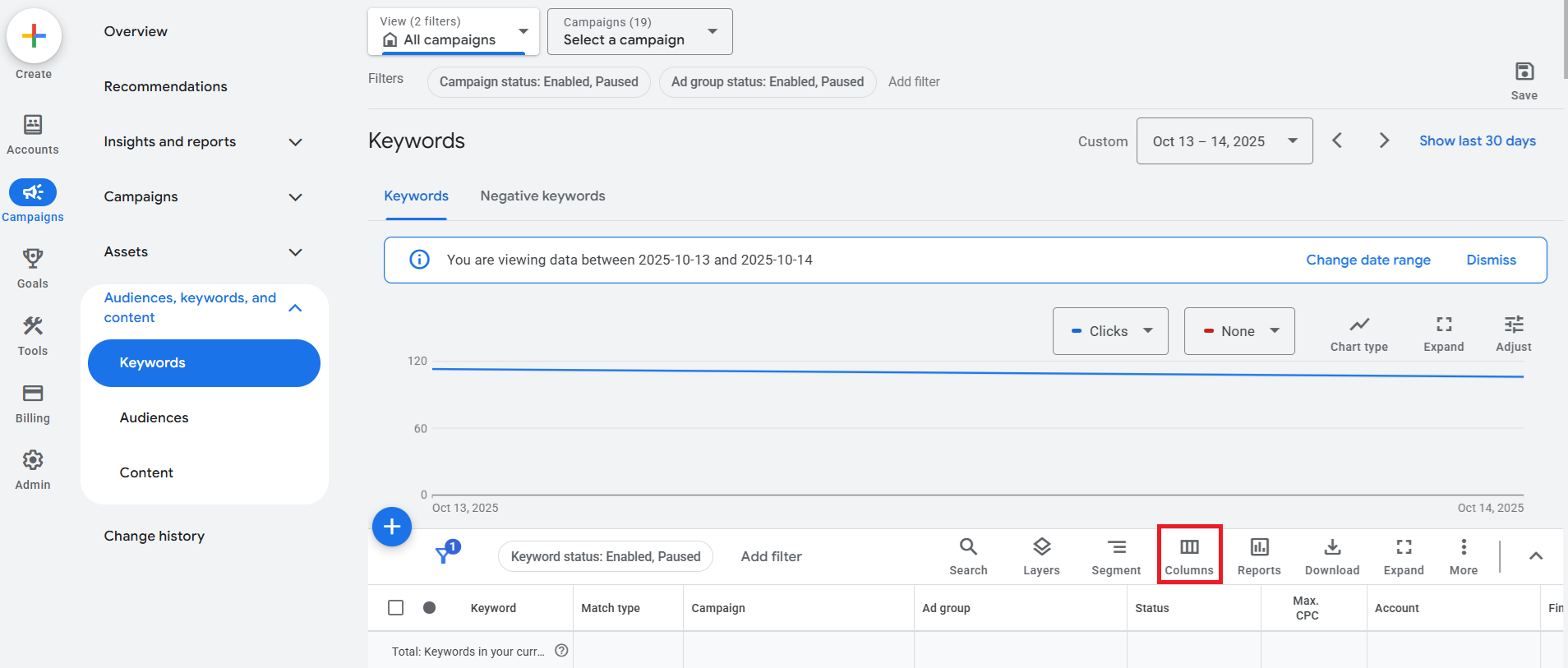 另一個關鍵字優化技巧,是排除關鍵字(Negative Keywords),避免廣告出現在不相關的搜尋結果中。您可以在 Google Ads 後台的「關鍵字」頁面,檢視各關鍵字的點擊數、轉換率等成效數據,將表現不佳、或明顯不符合目標受眾的關鍵字,加入排除關鍵字清單。
