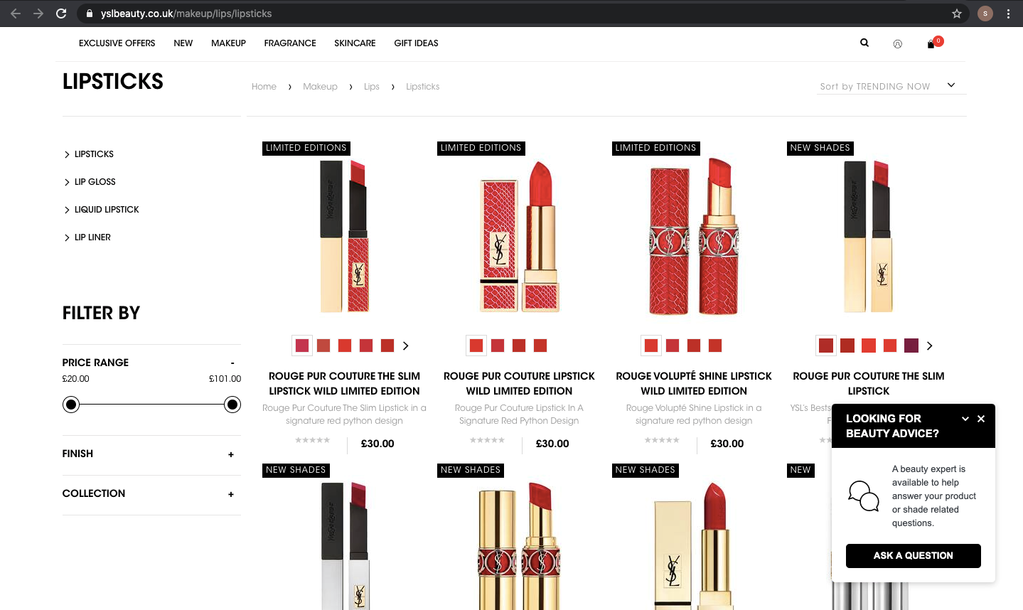 以 YSL 為例,當使用者在 Google 搜尋「YSL 口紅」時,點擊官方廣告後會直接進入口紅系列的登陸頁,而非首頁。頁面設計清楚聚焦產品分類,並優化結帳流程,讓消費者能更快速完成購買。